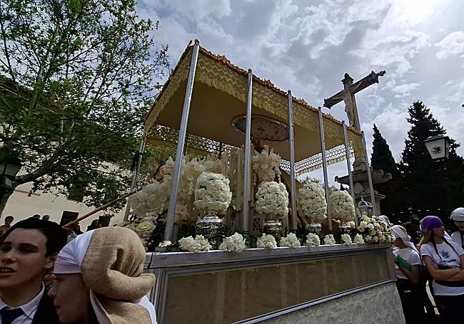 La quinta salida procesional de la cofradía escolar del colegio de Nuestra Señora del Rosario partió a las once de la mañana con las vistas puestas en el monumento de piedra del Señor de los Favores, un lugar especialmente significativo para el barrio del Realejo y para toda Granada cuando resta una semana para el Viernes Santo. Dos pasos se organizan desde el colegio, el de Nuestro Padre Jesús Nazareno, portado sobre paso procesional dorado, y la Virgen del Rosario de los Ángeles, bajo palio de malla de oro en un alarde de gusto cofrade que resultó muy aplaudido en todo momento.