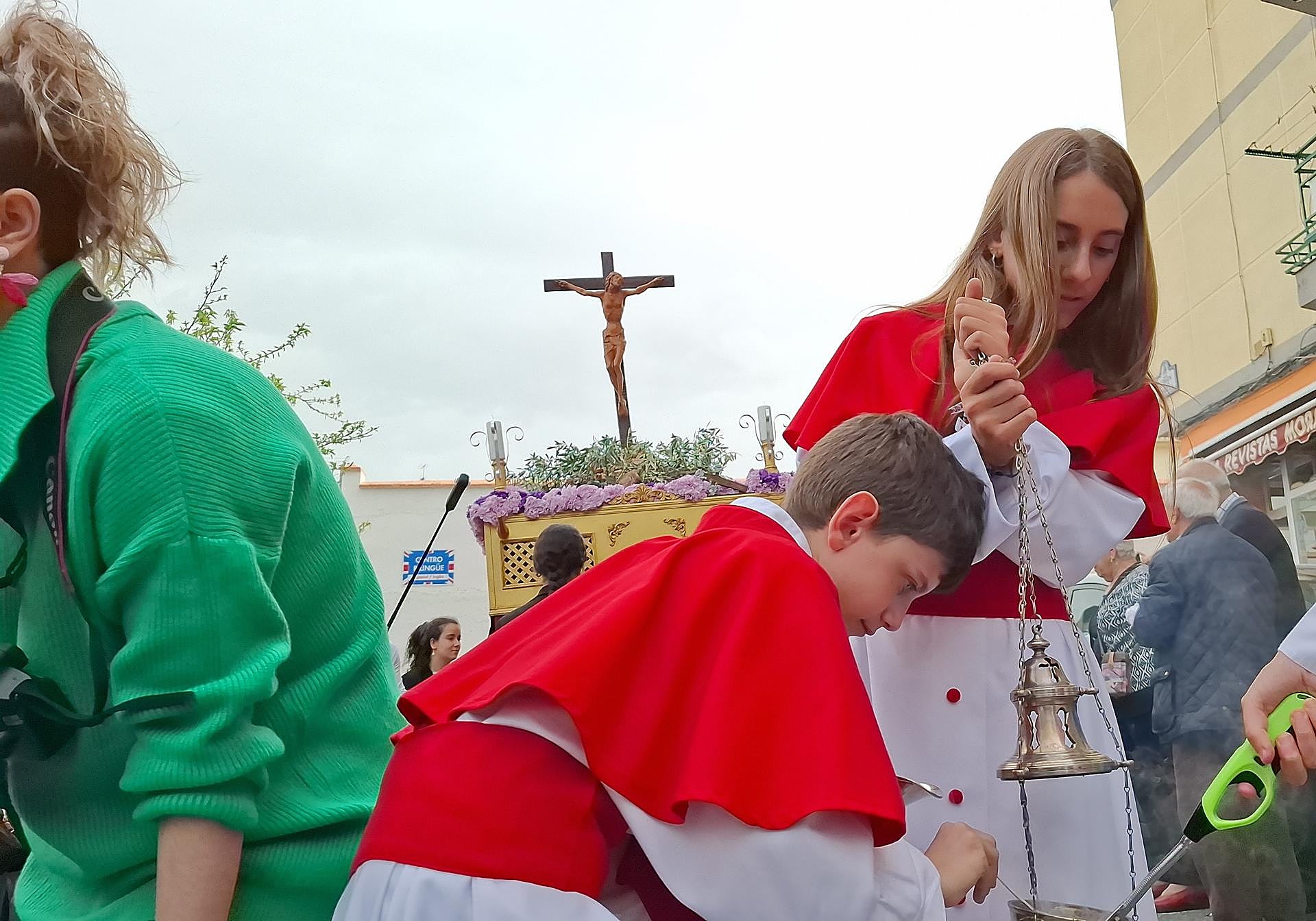 Hacía calor y el cielo aparecía cubierto por nubes, tal vez presagio de las incertidumbres climatológicas que se van a dar en estas próximas horas ... y el comienzo de la Semana Santa, pero para los niños no había duda alguna: «Salir, salimos» decían varios grupos de cofrades que habían tomado sus distintos enseres para llevar al Cristo de la Consolación y San Agustín por el entorno del colegio de Nuestra Señora de la Consolación, en La Chana.