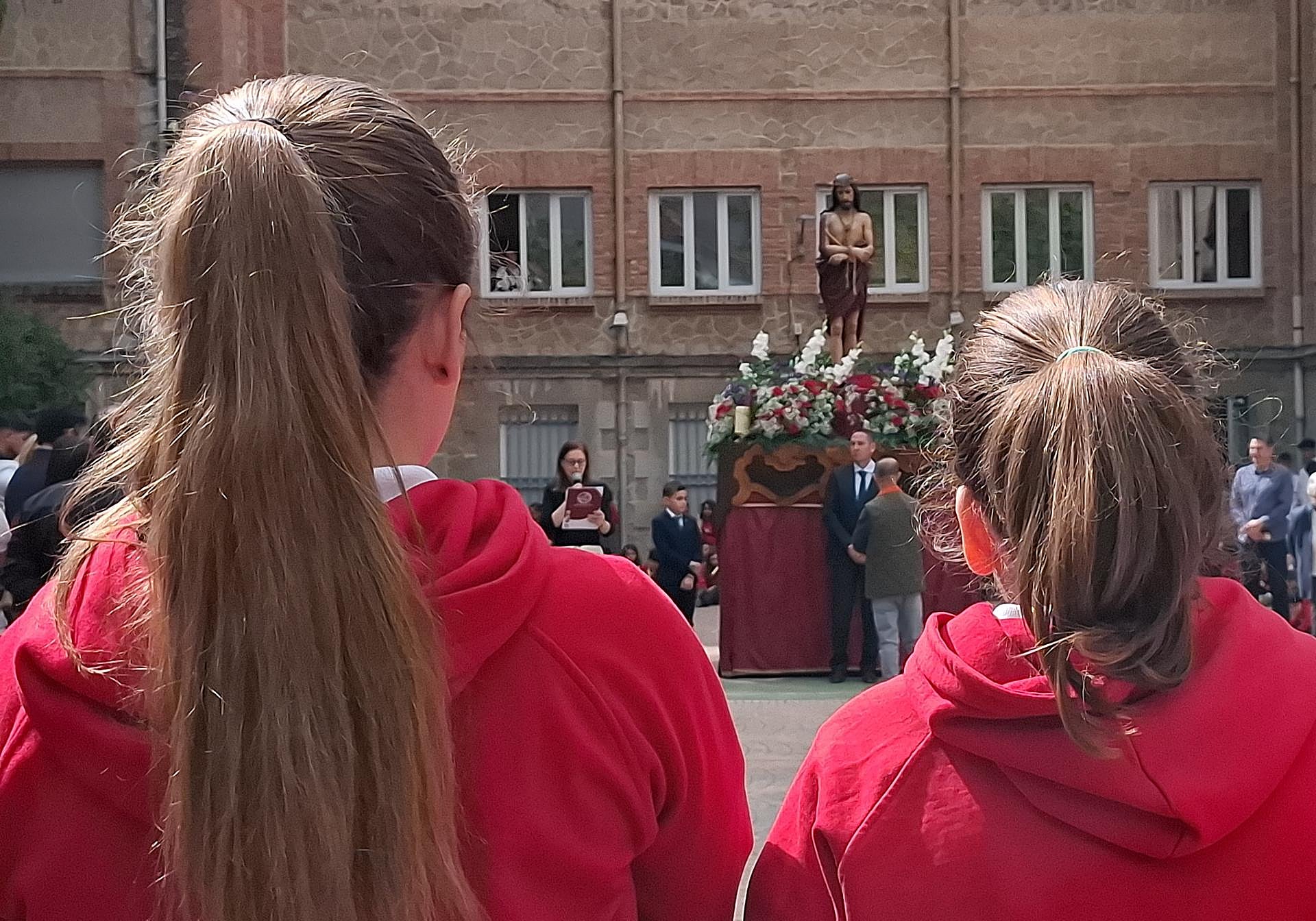 El barrio de la Chana se volcó con esta celebración en la la comunidad escolar se había esforzado. Sonaba el himno nacional para la imagen del Crucificado y por debajo de la plaza de acceso al colegio ya discurría un largo caminar de colegiales con la simulación de cirios y devoción puesta a esta imagen que se venera entre los muros escolares.