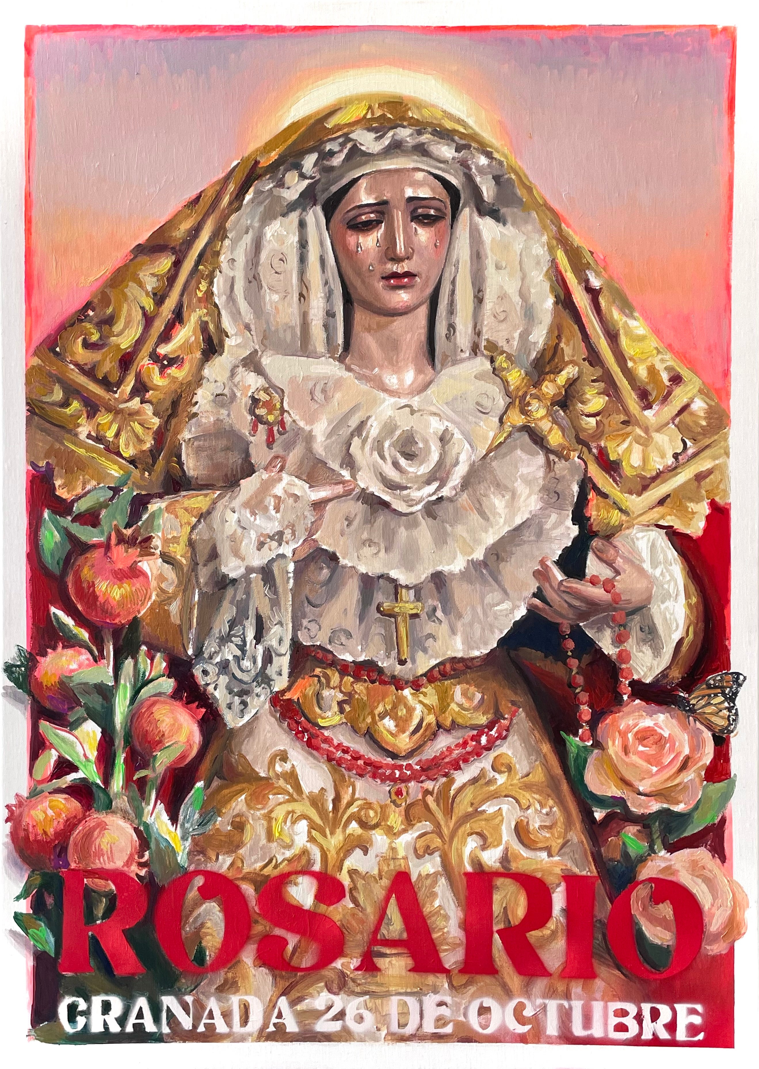 El cartel titulado «Rosario», obra del artista sevillano @rubenterriza_ ha sido el encargado de anunciar este acto tan esperado por los hermanos y devotos. La pieza se ha diseñado utilizando técnicas de óleo, acrílico y spray sobre lienzo, el artista lo describe como «un grito en la pared», un potente reclamo que llama a la comunidad a unirse en esta tradición que cierra el mes del Rosario.
