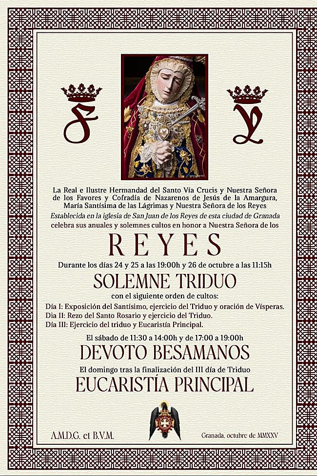 La Hermandad del Santo Vía Crucis en el Albaicín celebra esta semana el Solemne Triduo de Reglas en honor a Nuestra Señora de los Reyes, ... que tendrá lugar durante los días 24, 25 y 26 de octubre en su sede canónica, la iglesia de San Juan de los Reyes.