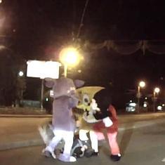 Justo entonces, cuatro personas disfrazadas de Bob Esponja, Mickey Mouse, la ardilla de 'Ice Age' y un conejo bajaron del minibús y empezaron a golpear al conductor del coche.
