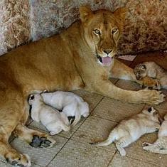 Una leona africana llamada Reina dio a luz a cinco cachorros saludables. Las camadas de leones son de dos o tres cachorros.