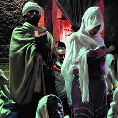 Desde primera hora de la mañana, los más devotos recorren la pendiente de baldosas que conduce a San Gabriel, para diseminarse después por prados y riscos asomados al abismo, entre letanías que parecen surgir del corazón de la tierra. Los más rezagados beben kezz, una hidromiel hecha con lúpulo, y comen injera, una especie de crep hecho de masa madre que utilizan para acompañar absolutamente todo en este país. Van vestidos con humildad, envueltos en telas de algodón blanco de las que asoman libros de oración, por lo general escritos en geez, el latín de los etíopes, un idioma semítico utilizado para las celebraciones litúrgicas pero desconocido para la mayoría de la población, que en esta región habla amárico. Besan con auténtico éxtasis las cruces repujadas que les ofrecen los sacerdotes, mientras grupos de músicos ponen banda sonora a los salmos y alientan la efervescencia de esa marea humana que confía en que el Más Allá les ofrecerá todo lo que se les ha negado en esta vida.