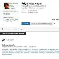 Priya no busca trabajo es el nombre de esta campaña ideada por Naya Nagar, que solicita ayuda para cambiar ladrillos por días de educación (20 euros son 80 días de escolarización). Gracias a los días de educación donados podemos conseguir que niños y niñas en la India tengan un futuro. Y que cuando crezcan, puedan rellenar el apartado de los estudios en su perfil de LinkedIn, informa Arancha Martínez, fundadora y directora de Naya Nagar.