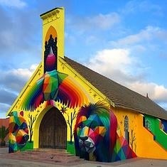 La iglesia tecnicolor, de la que da muestra gráfica en su cuenta personal de Instagram, sigue la estela de intervenciones anteriores entre las que destaca las pinturas de los muros de un templo austriaco reconvertido en parque para monopatinadores.