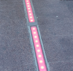 Tiene dos bandas en el suelo que nos indican si el semáforo está rojo o verde. Justo en el ángulo en el que miran los adictos al móvil y así evitar que un mensaje les cueste demasiado caro.