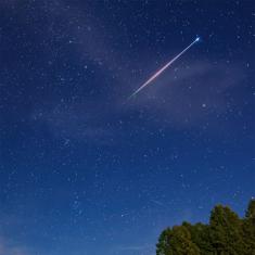 "Una pista de Perseidas luminosa, rápida y colorida, con una pequeña explosión al final, observada en el cielo de la noche de Torralba del Burgo, Soria, España"
