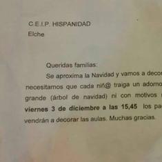 "Se aproxima la Navidad y necesitamos que cada niñ@ traiga un adorno al aula, por favor que no sea grande (árbol de Navidad) ni con motivos religiosos (belén)", se puede leer en la circular enviada.