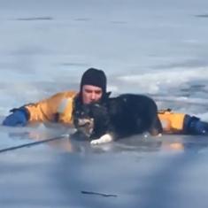 Un bombero arriesga su vida en un estanque congelado para salvar a un perro
