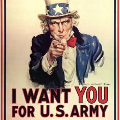 Bajo el lema "I want YOU for U.S. Army" ("Te quiero a TI para el Ejército de Estados Unidos"), el ilustrador James Montgomery Flagg colocó por primera vez en 1917 al Tío Sam en un cártel, aunque el personaje había nacido un año antes.