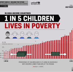 Según el informe de Unicef Construir el futuro. 'Los niños y los Objetivos de Desarrollo Sostenible', España se encuentra por debajo de la media en los objetivos de lucha contra la pobreza y reducción de la desigualdad, en ambos casos en el puesto 28 de 41. Este resultado es consecuencia de los altos niveles de pobreza monetaria (en 2014 el 30,5% de los niños, casi 3 de cada 10, vivían en pobreza relativa, 10 puntos más que la media de la OCDE) y de la escasa capacidad de las políticas sociales para reducirla. Respecto a la desigualdad, España es uno de los países cuya distancia entre los ingresos del 10% de los hogares más pobres y la media nacional es mayor, tan solo superado por Bulgaria, Rumanía y México. Además, se coloca en el puesto 36 del ranking en el objetivo de empleo y crecimiento económico, en el cual registra el peor resultado en términos comparativos.