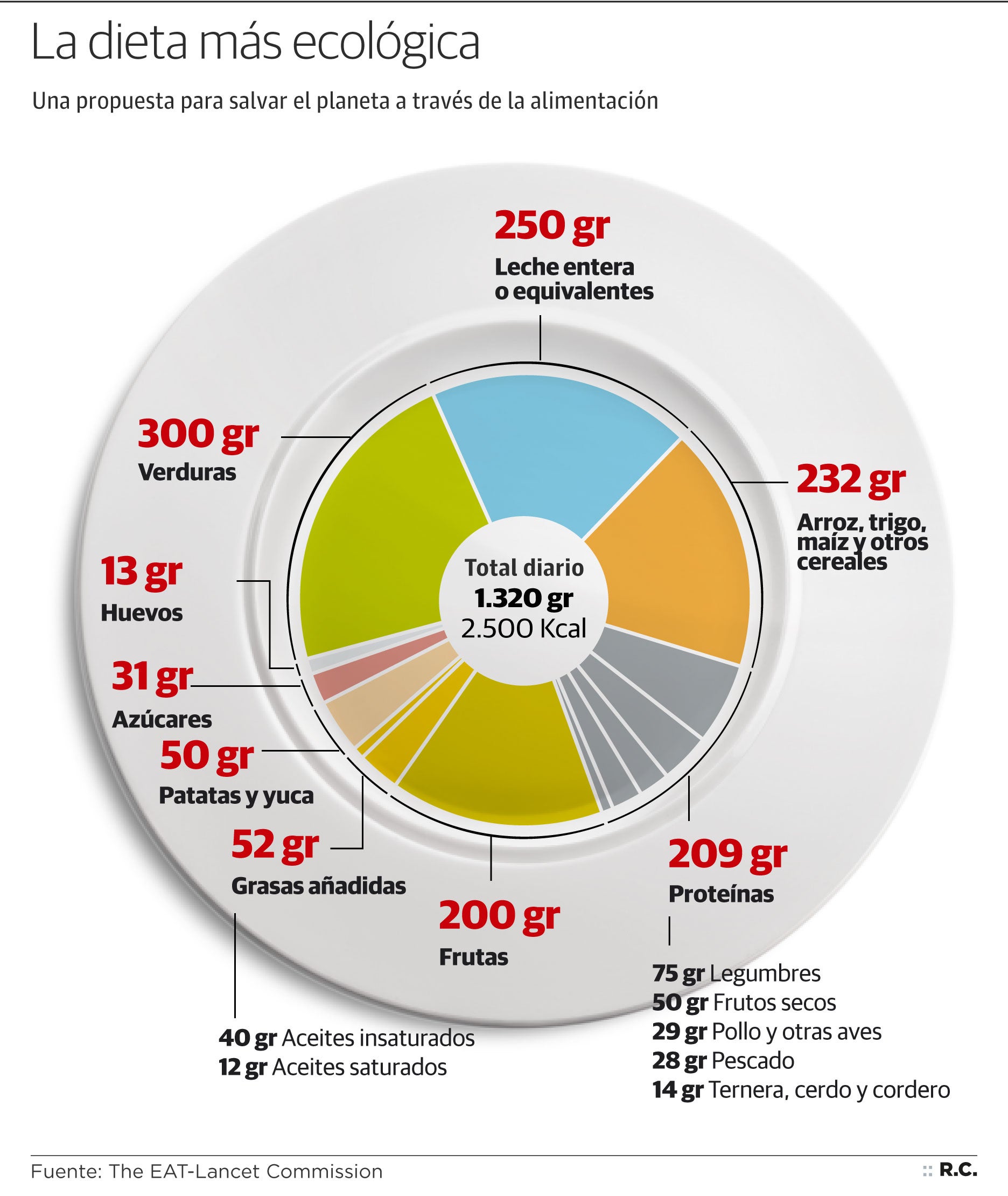 Una comisión de expertos internacionales ha elaborado un modelo de dieta que pretende conseguir dos objetivos muy importantes. El primero de ellos, reducir las emisiones de CO2 a la atmósfera ... . El segundo, hacer disminuir las tasas de obesidad. La dieta que han establecido por persona y día contiene un total de 2.500 kilocalorías, lo que equivale a 1.324 gramos de alimentos. Esta nueva forma de alimentación contendría: 200 gramos de frutas, 250 gramos de leche entera o equivalente de productos lácteos, 232 gramos de arroz, trigo, maíz y otros cereales, 300 gramos de verduras, 31 gramos de azúcares, 52 gramos de grasas añadidas (de los que 40 gramos serán aceites insaturados y 12 de saturados), 50 gramos de patatas y yuca, 13 gramos de huevos y 209 gramos de proteínas (75 gramos de legumbres, 50 gramos de frutos secos, 29 gramos de pollo y otras aves, 28 gramos de pescado y el resto de ternera, cordero y cerdo).