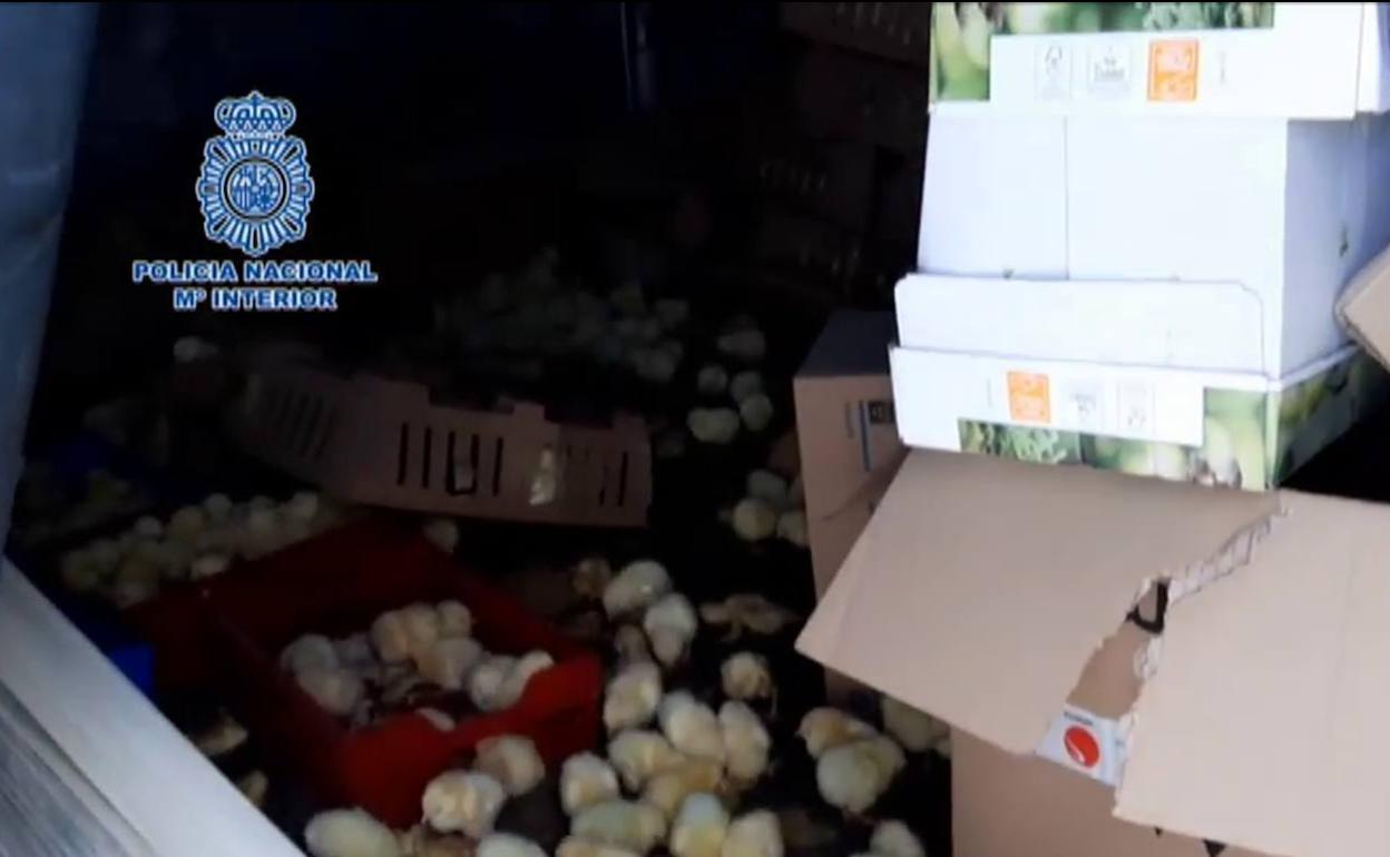 Sorprendente hallazgo de la Policía Nacional en el aeropuerto de Barajas. Se encontraron con veinte mil pollitos abandonados. Llevaban tres días hacinados ... y olvidados en la terminal de carga. Sus cajas de cartón se mojaron con la lluvia y los responsables de su envío, al no poder trasladarlos, los dejaron abandonados sin dar aviso.