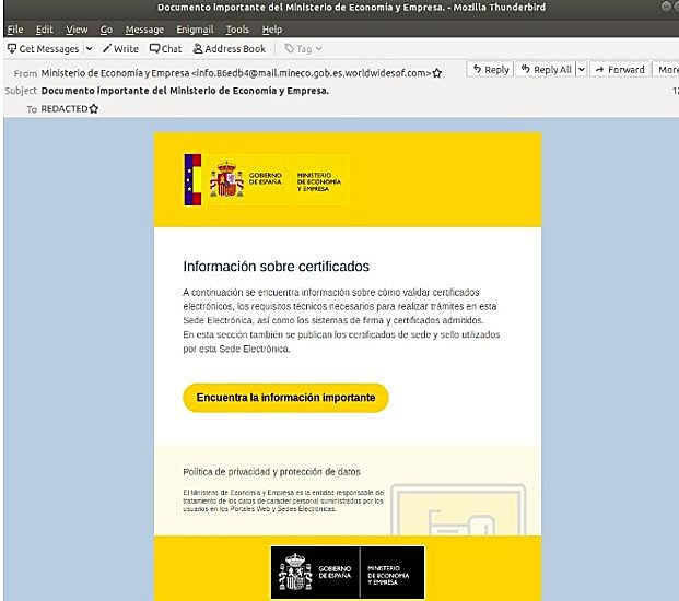 El correo electrónico fraudulento se envía desde una cuenta que no pertenece al dominio oficial de ese Ministerio bajo el asunto «Documento Importante del Ministerio de Economía y Empresa».