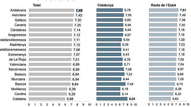 Curiosamente, del informe se desprende que los catalanes son, precisamente, los menos populares de todo el territorio español, con un 5,98 sobre 10. Les siguen los ceutíes, los melillenses, los vascos y los murcianos. Dentro de la comunidad catalana, sin embargo, los catalanes se llevan la puntuación más alta con un 8.