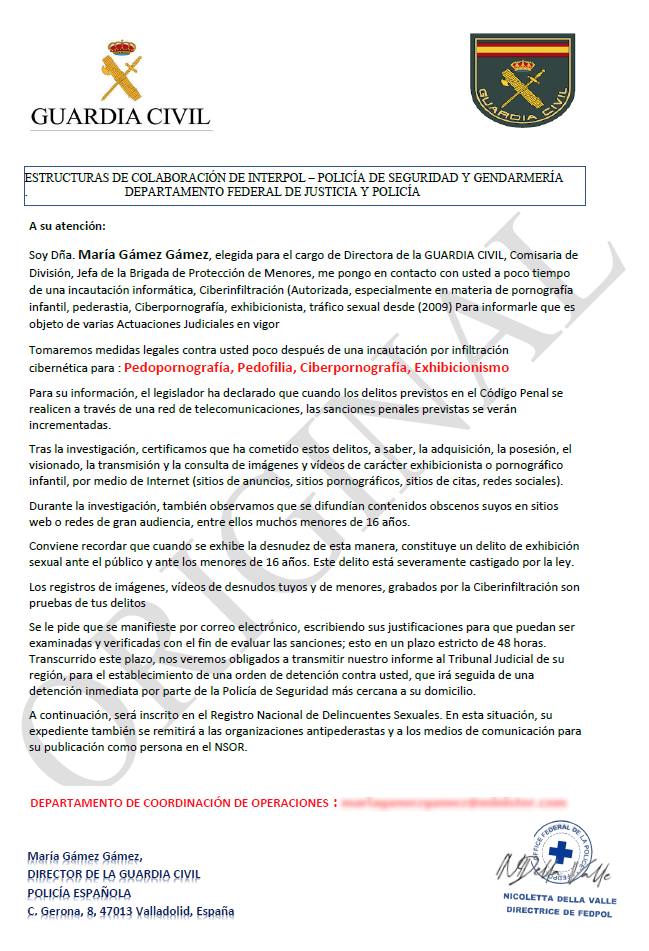 El correo electrónico de estafa aparece firmado por la directora general de la Guardia Civil, María Gámez Gámez. En este sentido, el texto, que simula ser un documento oficial, informa al receptor de que se han emprendido «acciones legales» en su contra como autor de los delitos de pornografía infantil, pedofilia, exhibicionismo, ciberpornografía y tráfico sexual.