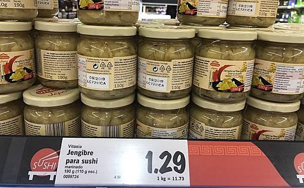 Jengibre para sushi: El jengibre encurtido es un elemento indispensable del sushi y consiste básicamente en jengibre marinado en vinagre de arroz con azúcar y sal. Se usa normalmente para limpiar nuestro paladar de sabores anteriores y dejarlo listo para experimentar un nuevo sabor, Lidl lo vende por 1,29 euros.