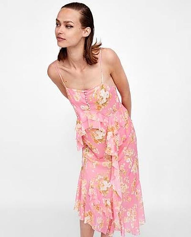 Destaca por su color rosáceo, estampado de flores, los volantes y sus tirantes 'spaghetti', otra de las últimas tendencias más marcadas para la nueva temporada. Incluso puede combinar con una cazadora o chaqueta como la que ya arrasa también en Zara y unas deportivas similares a las que puedes encontrar en Stradivarius.