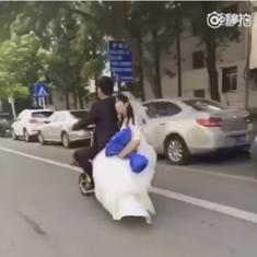 Una pareja de recién casados asiáticos inició su matrimonio de una manera nada convencional. Mientras paseaban en una scooter eléctrica, pasaron sobre un reductor de ... velocidad y la novia se cayó al asfalto.