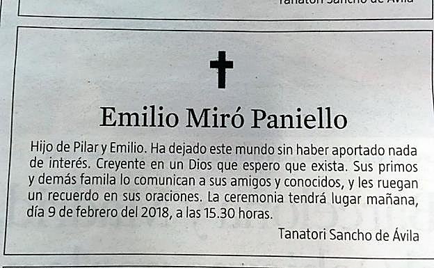 “Hijo de Pilar y Emilio, deja este mundo sin haber aportado nada de interés. Creyente en un Dios que espero que exista. Sus primos y demás familia lo comunican a sus amigos y conocidos y les ruegan un recuerdo en sus oraciones”, rezaba la nota sobre Emilio Miró Paniello,