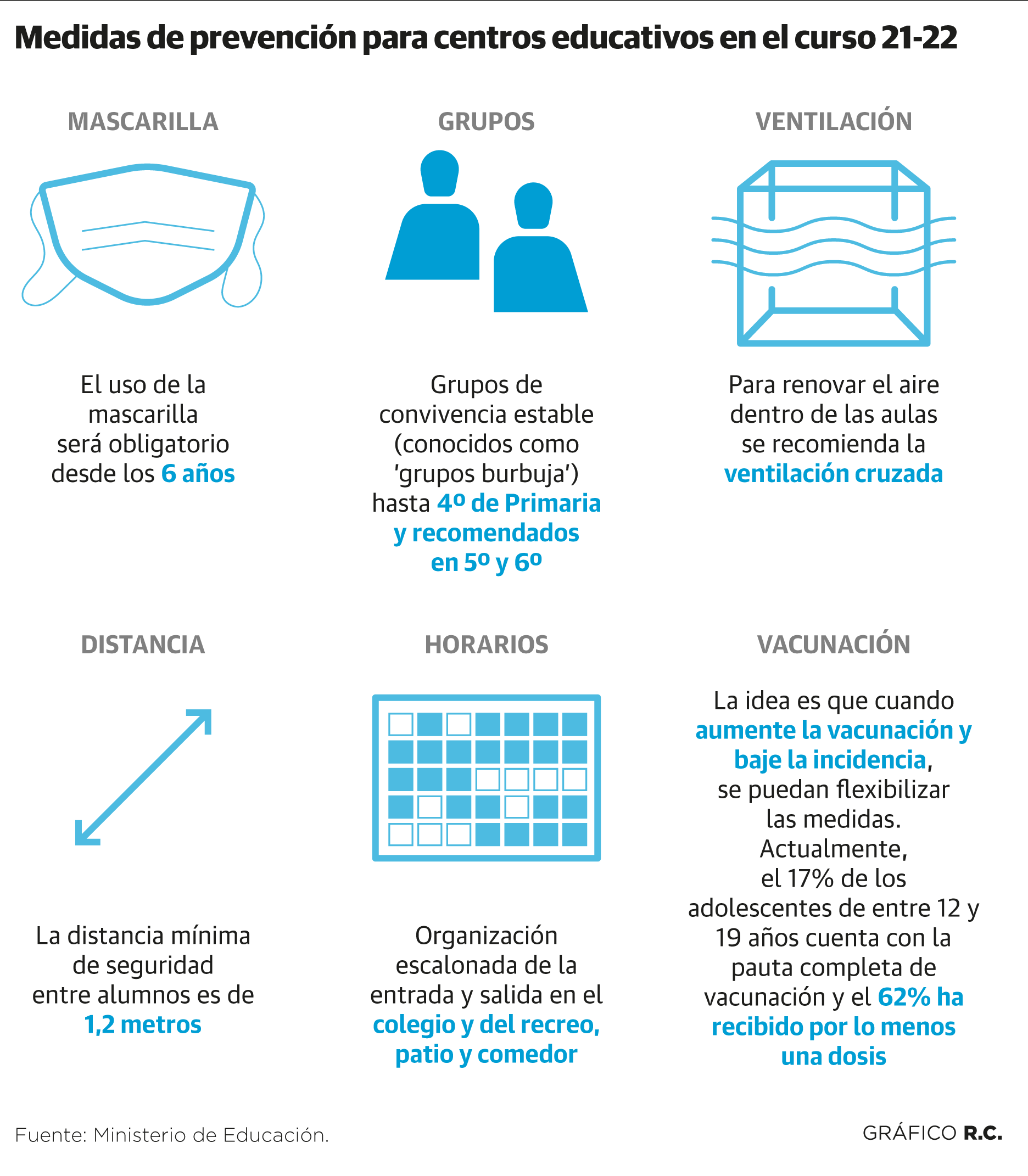 La guía para la vuelta al cole de septiembre sigue siendo la misma que el ministerio y las consejerías acordaron en mayo y concretaron en junio. El documento 'Medidas de prevención, higiene y promoción de la salud frente a covid-19 para centros educativos en el curso 2021-2022', publicado el 29 de junio, establece la mascarilla obligatoria para todos los mayores de seis años, aunque con la posibilidad de no utilizarla en determinadas actividades al aire libre; grupos de convivencia estable (conocidos como 'grupos burbuja') hasta 4º de Primaria y si fuera posible, también en 5º y 6º; distancia como mínimo de 1,5 metros entre alumnos, que se podrá reducir en algunos supuestos a partir de 5º de Primaria; ventilación «cruzada y frecuente» en las aulas y organización escalonada de la entrada y salida al colegio, en el recreo, en el patio y en el comedor.