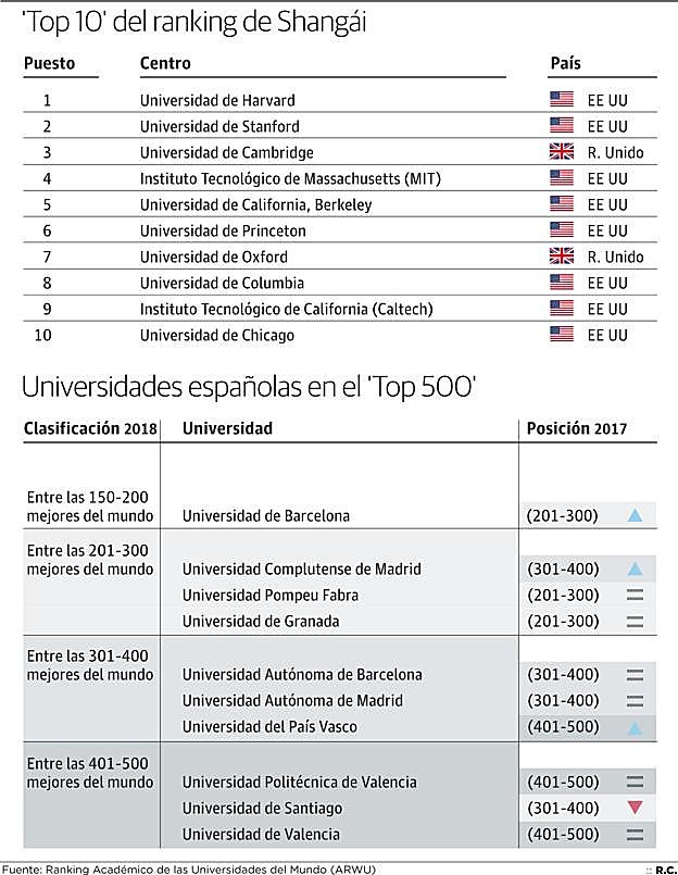 El conocido como 'ranking de Shanghái', la clasificación planetaria de universidades más antigua, prestigiosa e influyente, en su edición de 2018, solo incluye a diez centros españoles entre los 500 mejores, uno menos que el año anterior, lo que confirma una pérdida de presencia en la élite mundial, con una goteo negativo y continuado desde 2015, cuando España alcanzó su máximo y logró colocar a 13 campus en este 'top 500'. Como ocurre desde la primera edición, en 2003, no hay españoles entre los cien primeros y la Universidad de Barcelona es la única que logra estar entre los 200 mejores, algo que el centro catalán consigue desde 2014, con el paréntesis del año pasado.