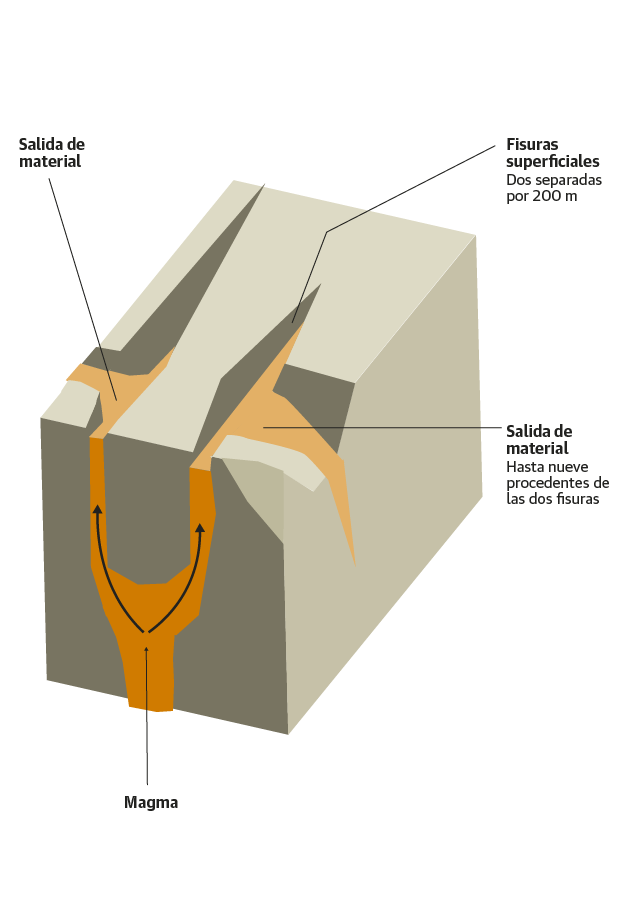 Al alcanzar la superficie, el magma puede brotar por varios puntos de emisión. Lo más probable es que continúen apareciendo nuevos puntos, como ya sucede desde el martes junto a la población de Tacande, a 900 metros de las primeras fisuras.