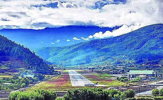 A quien visite el pequeño reino del Himalaya le espera una pista de 2.000 metros, rodeada de montañas que superan los 5.500. Opera de día y sólo 17 pilotos están capacitados para utilizarla. En resumen, una pesadilla.