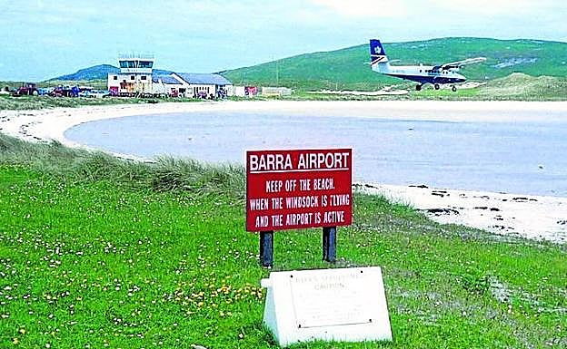 En la bahía de Traigh Mhòr, la pista es tan corta que los aviones llegan hasta la playa (el único del mundo que lo hace) y cuando sube la marea, desaparece.