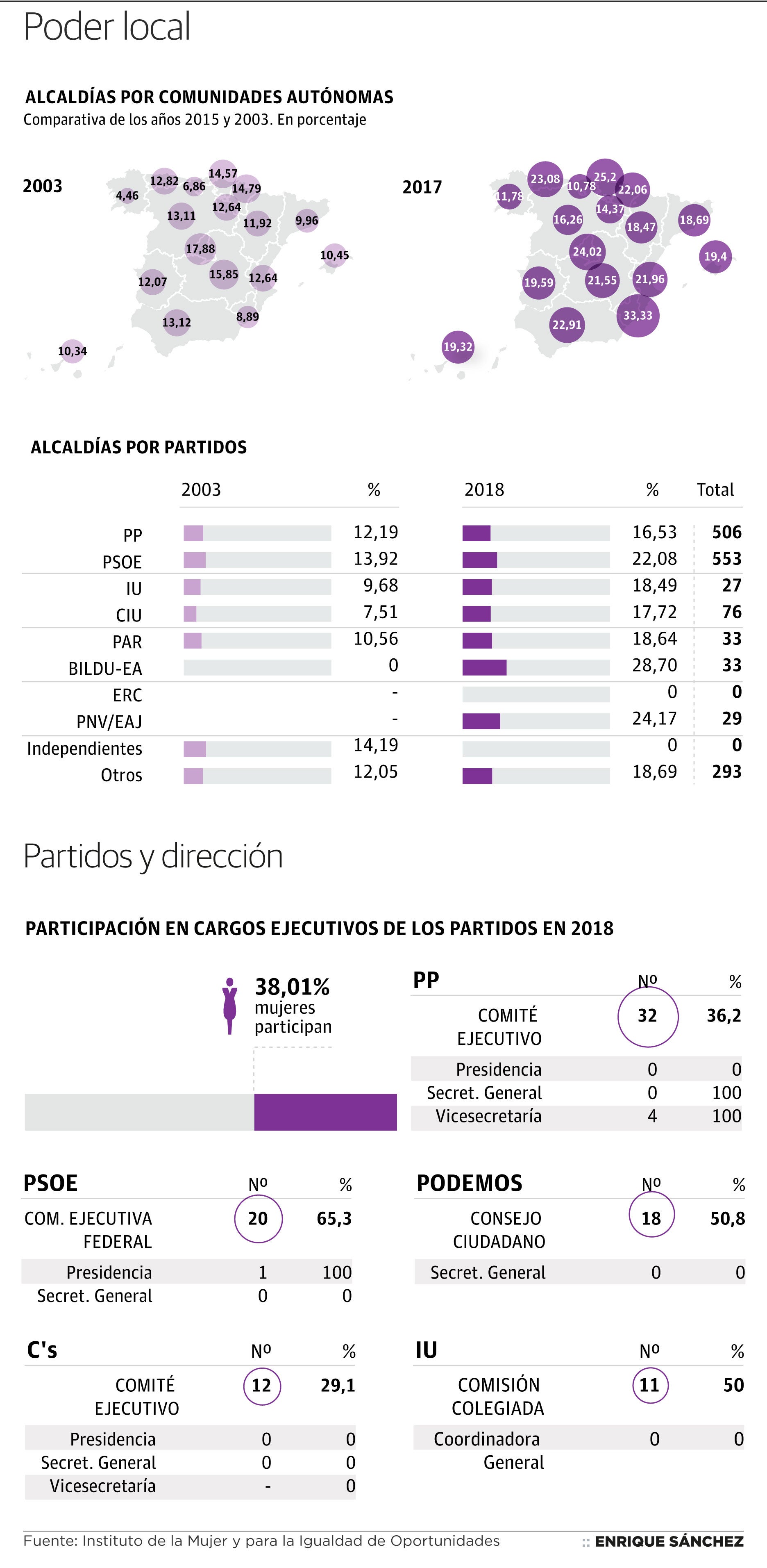 Su representación en la política y en la economía está lejos de la igualdadSólo el 19% de los ayuntamientos están dirigidos por alcaldesas; apenas el 14% de los magistrados del Tribunal Supremo son mujeres; en las Ejecutivas de los principales partidos políticos las mujeres representan de media el 38% pero todos sus líderes nacionales son hombres. El Gobierno de Pedro Sánchez ha sido el primero en el que el número de ministras ha superado al de ministros, pero en las próximas elecciones generales no hay candidatas a la Presidencia del Gobierno: se les ha reservado el segundo puesto y se muestra como un triunfo.
