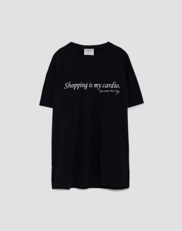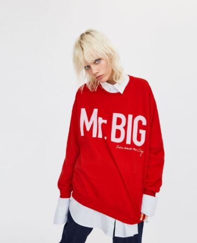 Ejemplo de ello es esta sudadera roja con las palabras “Mr. Big’, ese personaje que volvía loca a Carrie Bradshaw y cuyo nombre no se desvela hasta el final de la ficción. También encontramos una camiseta de manga corta con las palabras “shopping is my cardio” marcadas en el pecho.