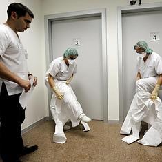 Dos auxiliares se colocan los trajes de protección en presencia de un instructor, durante los cursos de simulación en el Hospital La Fe de Valencia.