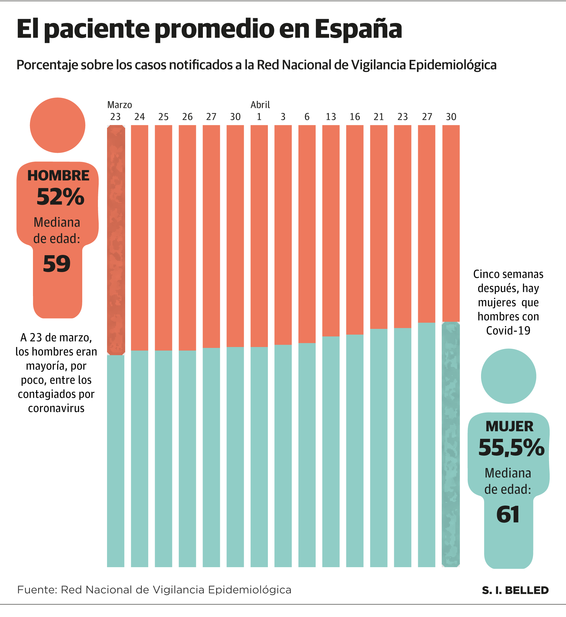 El impacto del coronavirus ofrece sorpresas, que pueden ser más eventuales o permanentes. La Red Nacional de Vigilancia Epidemiológica (Renave) ha ido publicando con cierta periodicidad -al menos un par de informes semanales- los datos de contagio desde finales de febrero. Entonces, hace ya dos meses, sus informes apenas ocupaban cinco páginas. Ahora son quince y con multitud de variables para poder estudiar cómo se comporta el virus. En el primer informe accesible solo se analizaron 18 de los 32 casos; el pasado jueves, 30 de abril, ya se habían analizado 203.715 casos. Hace sesenta días, ocho de cada diez pacientes eran hombres y los síntomas más frecuentes eran fiebre, disnea -dificultad para respirar- y tos seca. Estos síntomas se mantienen, pero cuatro de cada diez pacientes también presentan problemas digestivos. Y el paciente que predomina ya no es un hombre. Ha cambiado de sexo. Ahora, el 55,5% de los casos diagnosticados son mujeres.