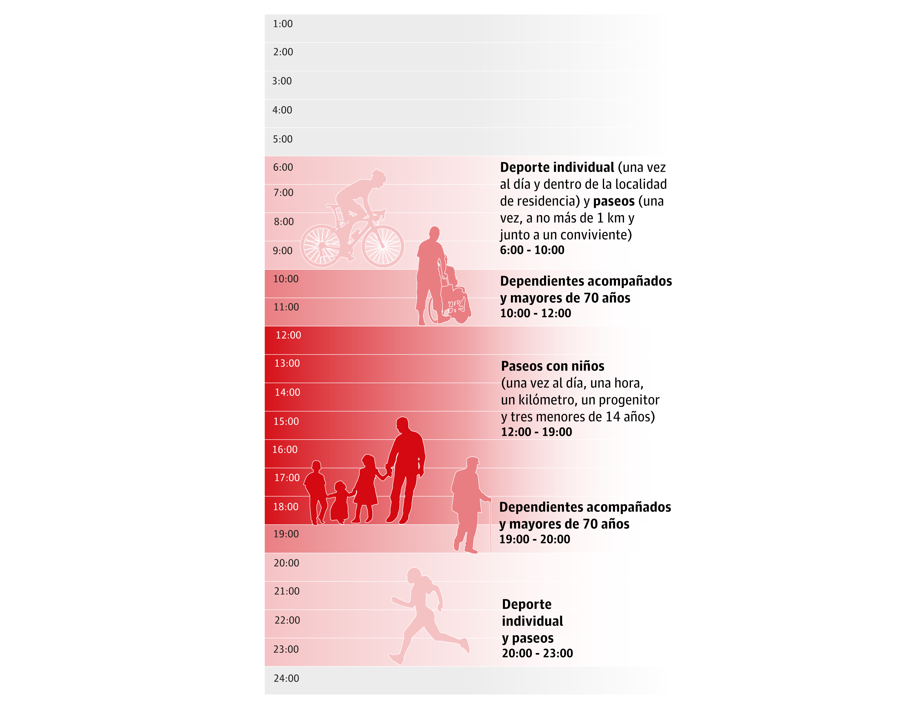 Deportistas, padres con niños y mayores de 70 no coincidirán en los paseos diarios que podrán realizar desde el 2 de mayo. Así lo determina el Ministerio de Sanidad, que ha preparado el siguiente horario para organizar las salidas de la población general a la calle: