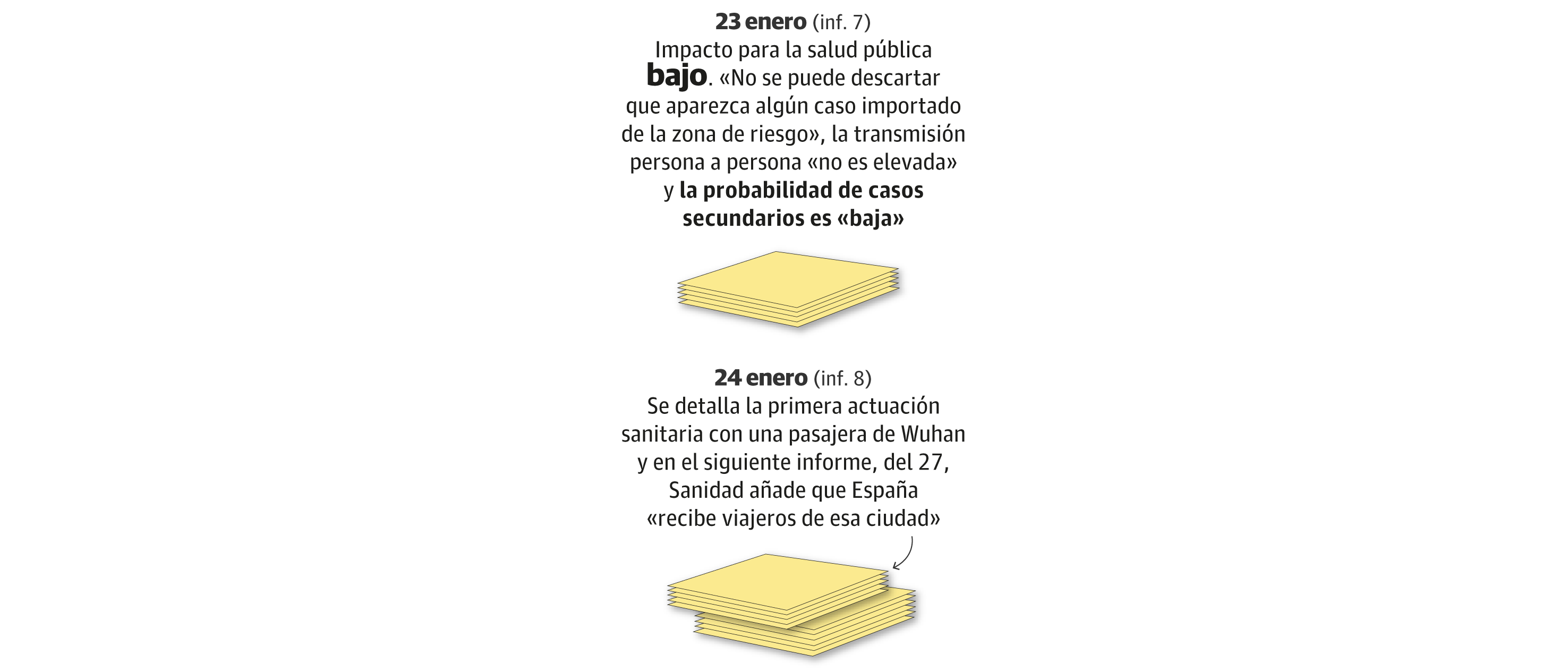 Hacen falta nueve informes para que se reconozca que España «recibe viajeros» de Wuhan. El cambio en la valoración del riesgo por parte de Sanidad, a través del Centro de Coordinación de Alertas y Emergencias Sanitarias, tarda poco en llegar.