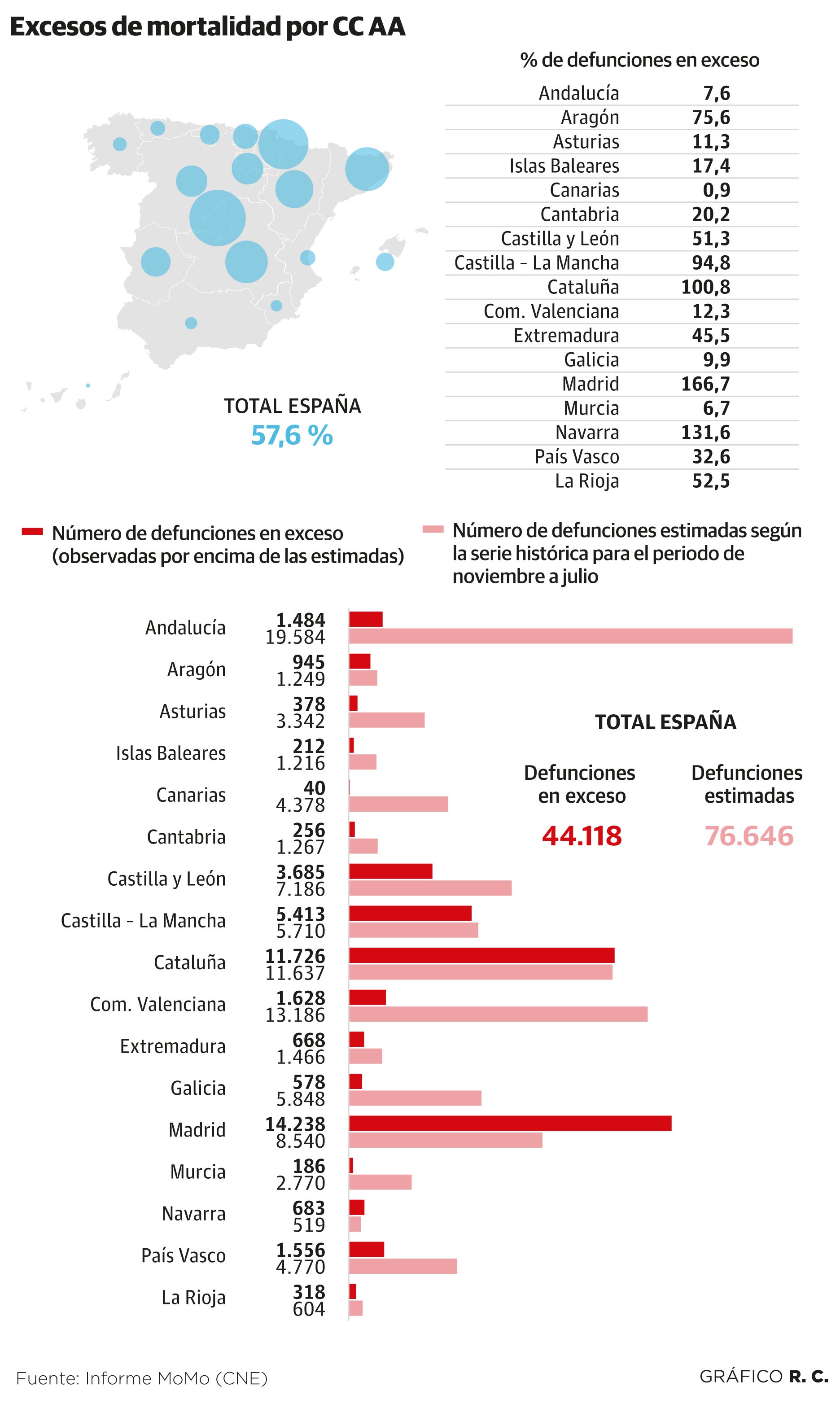 Le siguen Navarra (con 131,6% de exceso de mortalidad y 683 muertos de «exceso»); y Cataluña (con 100,8% de exceso y 11.726 óbitos inesperados). En el otro extremo ese sitúan precisamente las regiones que con menos saña sufrieron la primera oleada: Canarias (con un exceso de decesos de un 0.9% y apenas 40 muertos de más de los esperados); Murcia (6,7% más de fallecidos y 186 muertos en «exceso»); y Andalucía (un superávit de fallecidos de solo el 7,6% y 1.484 muertos más).