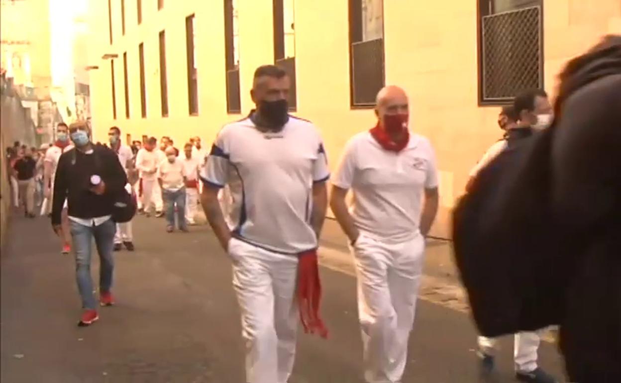 En clave de homenaje, perfectamente pertrechados con ropa blanca y pañuelo rojo, una treintena de mozos, algunos de los más veteranos, han pateado las calles sin los nervios de otras ocasiones