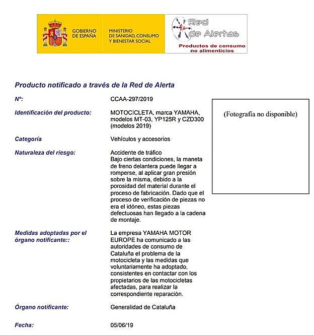 En el primero de los casos se trata de la Yamaha MT-03 YP125R y CZD300 (2019). Según la Agencia «bajo ciertas condiciones, la maneta de freno delantera puede llegar a romperse, al aplicar gran presión sobre la misma, debido a la porosidad del material durante el proceso de fabricación».