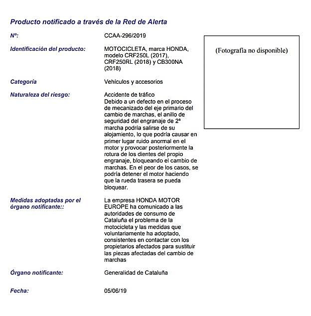 En el segundo de los casos la alerta se extiende a 3 modelos de Honda, los CRF250L (2017), CRF250RL (2018) y CB300NA (2018). Aquí se ha producido un defecto en el proceso de mecanizado del eje primario del cambio de marchas. El anillo de seguridad del engranaje de 2ª marcha podría salirse de su alojamineto, lo que podría causar, en primer lugar, ruido anormal en el motor y, posteriormente, la rotura de los dientes del engranaje, bloqueando el cambio de marchas. «En el peor de los casos», refleja la Aecosan, «se podría detener el motor, haciendo que que la rueda trasera se pueda bloquear».