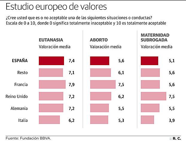 España, de hecho, es el segundo país de los cinco estudiados con un mayor apoyo social a la legalización de la eutanasia, ya que en el baremo de 0 y 10 -el sistema para medir el grado de aprobación que usa el estudio- logra un respaldo medio de 7,4, solo superado por el 7,9 de Reino Unido. Pero no solo es una aceptación muy alta sino también general. Son partidarios de su regulación la mayoría de los españoles de todos los sexos, edades e ideologías. Incluso los más religiosos, pese a la oposición de la Iglesia, le otorgan un 6. El apoyo es claro y se consolida con los años, pues es un 15% superior al que recibió en el estudio equivalente realizado por la Fundación BBVA en 2012.