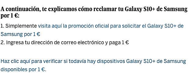 No es la primera vez que aparece un timo relacionado con Samsung. Al igual que en ocasiones anteriores, aparece a través de redes sociales ... y Whatsapp. En esta ocasión se hace referencia al lanzamiento del Samsung Galaxy S10+ al precio de un euro, y con una suscripción de 40€ al mes.