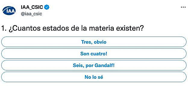 Mientras, el científico explicó la materia de las estrellas. Después, se contabilizaron las respuestasa. Ganó la número 3 con un 72%. Pero como es tema científico, requiere una explicación. «Está bien en régimen básico. Pero si bajamos la temperatura cerca del 0 absoluto aparecen dos estados más, los condensados. Incluso en condiciones extremas hay muchos más. Y teóricamente muchos más».
