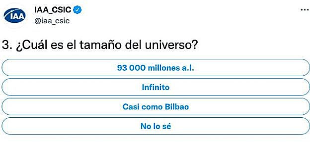 El ejemplo sirve para explicar que lo mismo sucede con el Universo, un lugar donde las cifras son tan enormes y con tantos ceros que uno se queda infinitesimalmente pequeñito. Es lo que más respondió la gente, infinito, un 44%.