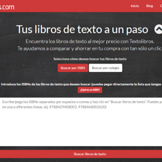 Este comparador online, que han puesto en marcha tres emprendedores españoles, a Textolibros.com es una plataforma totalmente gratuita. Su funcionamiento es cómodo y rápido gracias a un sencillo buscador por código ISBN del libro o también por centro escolar. En el primer caso, el padre o la madre tan solo tiene que copiar los códigos ISBN de los libros que forman la lista que le entregaron en el colegio.