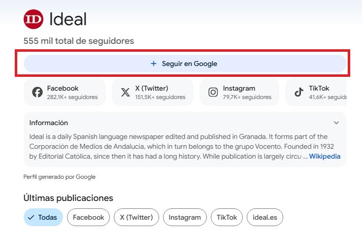 Cabe destacar que el algoritmo de Google muestra las noticias en función de cientos de factores, pero si pulsas en seguir a IDEAL, te aseguras de recibir una información de rigor, veraz y contrastada sobre los temas que más te interesan.