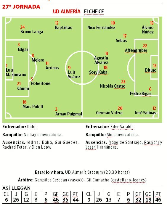 El madrileño puede ser el primer candidato para ser la brújula indálica en la cita de hoy en el UD Almería Stadium. Habría que ver con qué acompañante porque la posesión de balón en este duelo será clave. Se ha visto que el Elche sufre sin balón y que persigue crecer desde la posesión, que ha sido lo que le ha permitido ser firme candidato al ascenso a Primera.