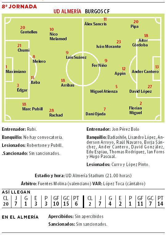El primero a la UDA: El de la tarde de hoy, a jugar en el UD Almería Stadium, es el primer partido de Liga que le arbitra al equipo almeriense, al no haber coincidido con los rojiblancos en la militancia en la misma categoría. No es el caso del Burgos CF, al que concretamente en la pasada temporada le arbitró tres, todos jugando en su feudo de El Plantío, que finalizaron con dos empates y una derrota blanquinegra.