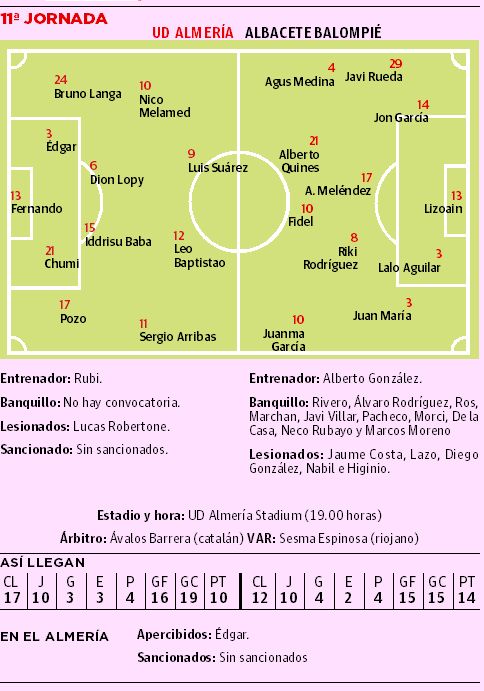 No va a ser fácil por más que el Albacete llegue peleando por salir de abajo, propósito prioritario e idéntico al de la UDA para, a partir de ese logro pensar en otra cosa. Rubi tiene menos dudas hoy que ayer o que el domingo. De los que jugaron en La Romareda están todos y encima se unen el central serbio Aleksandar Radovanovic y el delantero Rachad Fettal, tras el obligado descanso en Zaragoza por culpa de sus expulsiones en Oviedo.