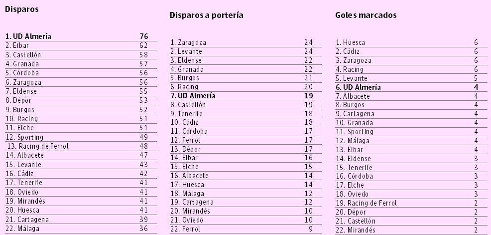 No cabe duda que, observando las clasificaciones específicas –la de disparos totales, la dirigida entre los tres palos y el gol– no tienen secretos, si bien es cierto que hay equipos con déficits entre los que se encuentra el conjunto indálico, obligado a salvar sinergias si no quiere sufrir.